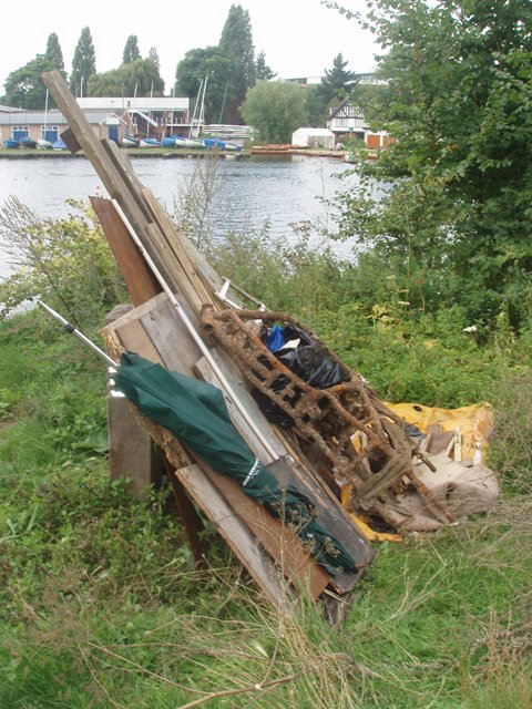 20th April 2010 – Members of the TAC collected an office chair, a sash window clamp, 50 vodka bottles and copious amounts of timber/laminate from next to Hampton Court Bridge. 20 large black bags were also filled with rubbish. A local company offered the use of their skip for disposal of the large heavy items while Elmbridge Council collected the twenty bin bags.