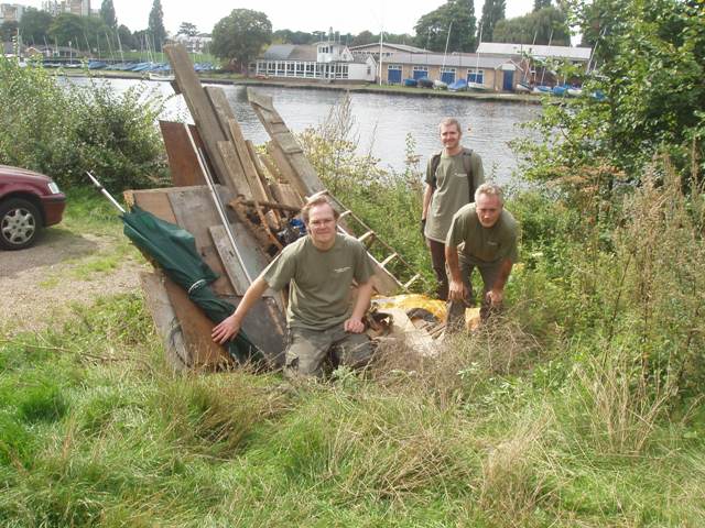 The objects removed were mainly wooden planks, used as gang planks, other smaller pieces of wood. The TAC removed two large steel sheets that had been left, an old plastic boat, boat steps and a rusty motorcycle frame. The work was back breaking and very tough but very rewarding. Lots of walkers were about and very encouraged that a group of Anglers should be doing it. The local council are to pick up everything that we cleared.